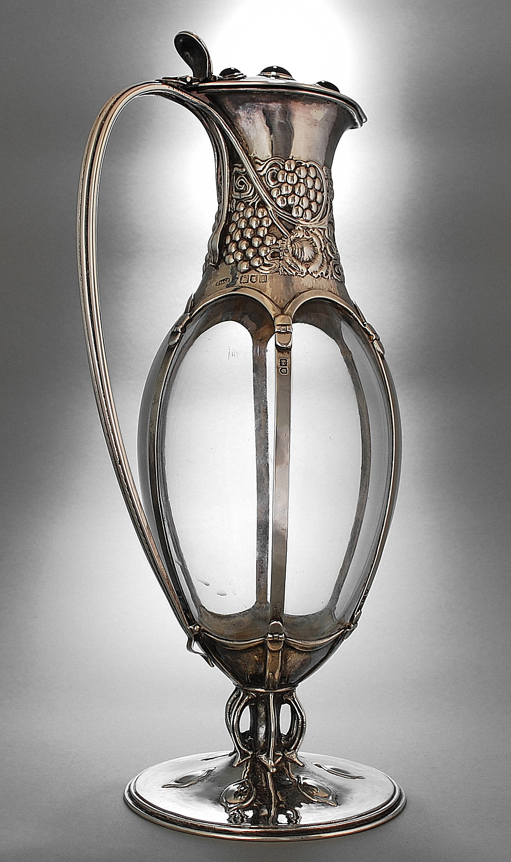 The distinctive appearance of Ramsden and Carr’s silverware came from combining simplified flowing lines from the Art Nouveau with design elements derived from Britain’s historical past and the use of traditional craftsmanship and techniques. Hand hammered surfaces were proudly left visible and not removed by sanding, polishing or electro-cleaning nor concealed by electro-plating. These hammered or planished indentations can be clearly seen as a duller shade of grey, due to copper oxide known as “fire stain”, which occurs on all handmade silver. The effect was further augmented by their frequent use of applied decorations such as enamelled bosses, semi-precious stones and enamelling.