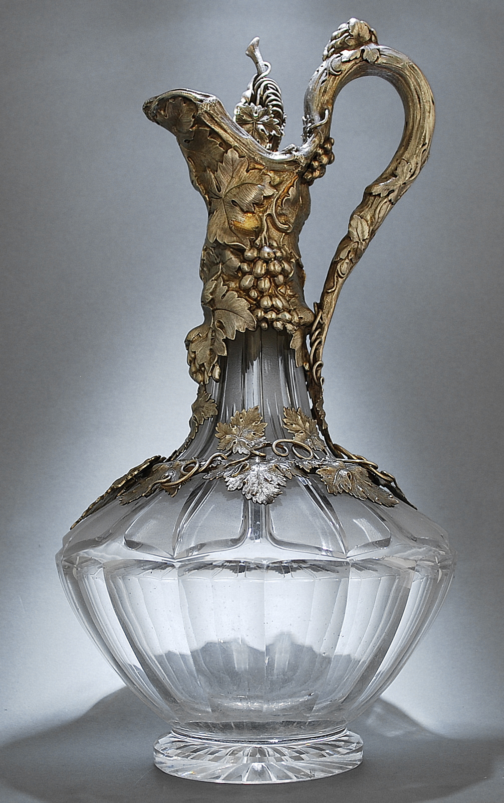 The fluted glass body with frosted upper flutes & plain lower flutes, the neck and handle chased with fruiting vines, the mount continuing around the body in the form of an openwork band of trailing tendrils and vine leaves, the front with a vine leaf label pierced MADEIRA, the detachable cork stopper mounted with grape cluster and double vine leaf finial