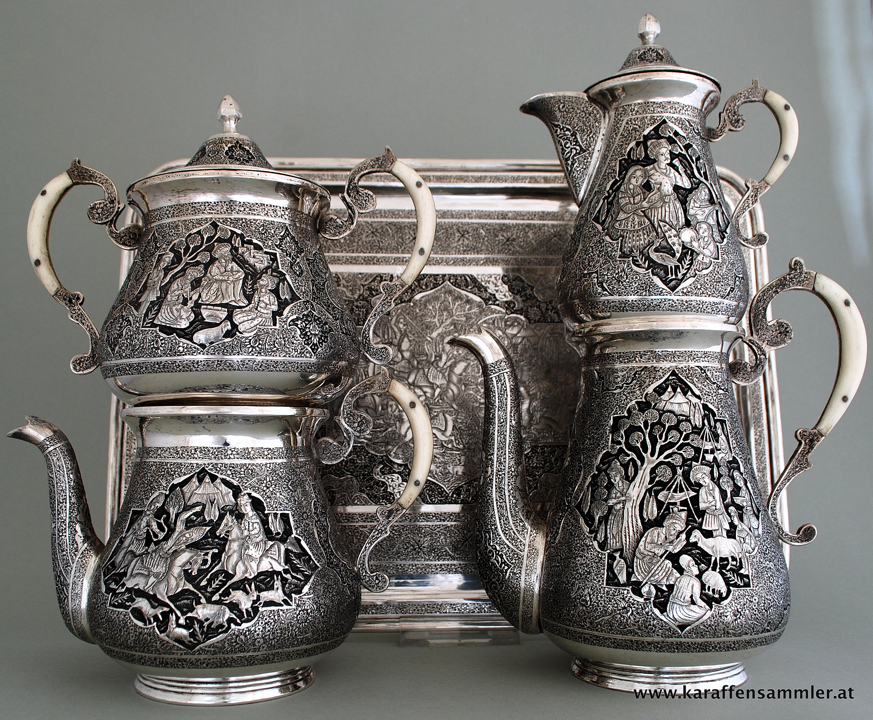 Remarkable 4 piece persian silver set plus tray by famous Ostad Lahiji