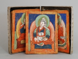 Tsaklis are small cards of layered stiffened handmade paper or of sized cloth, painted on one side and often with a Tibetan syllable, word, line, or several lines of calligraphy on the reverse. They are assembled into sets and depict specific deities and symbols associated with rituals practiced in Tibetan Buddhism. The rituals may include empowerment ceremonies, transmission of teachings, and funerals and the cards usages may be as substitutes for ceremonial items or as visualization aids.